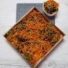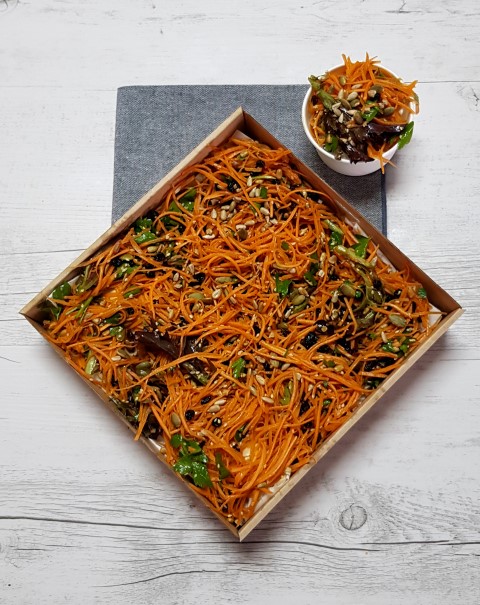 Our carrot salad with our twist. Shredded carrot, toasted sunflower, pepitas , sesame seeds, sweet currants & infused sesame oil dressing.