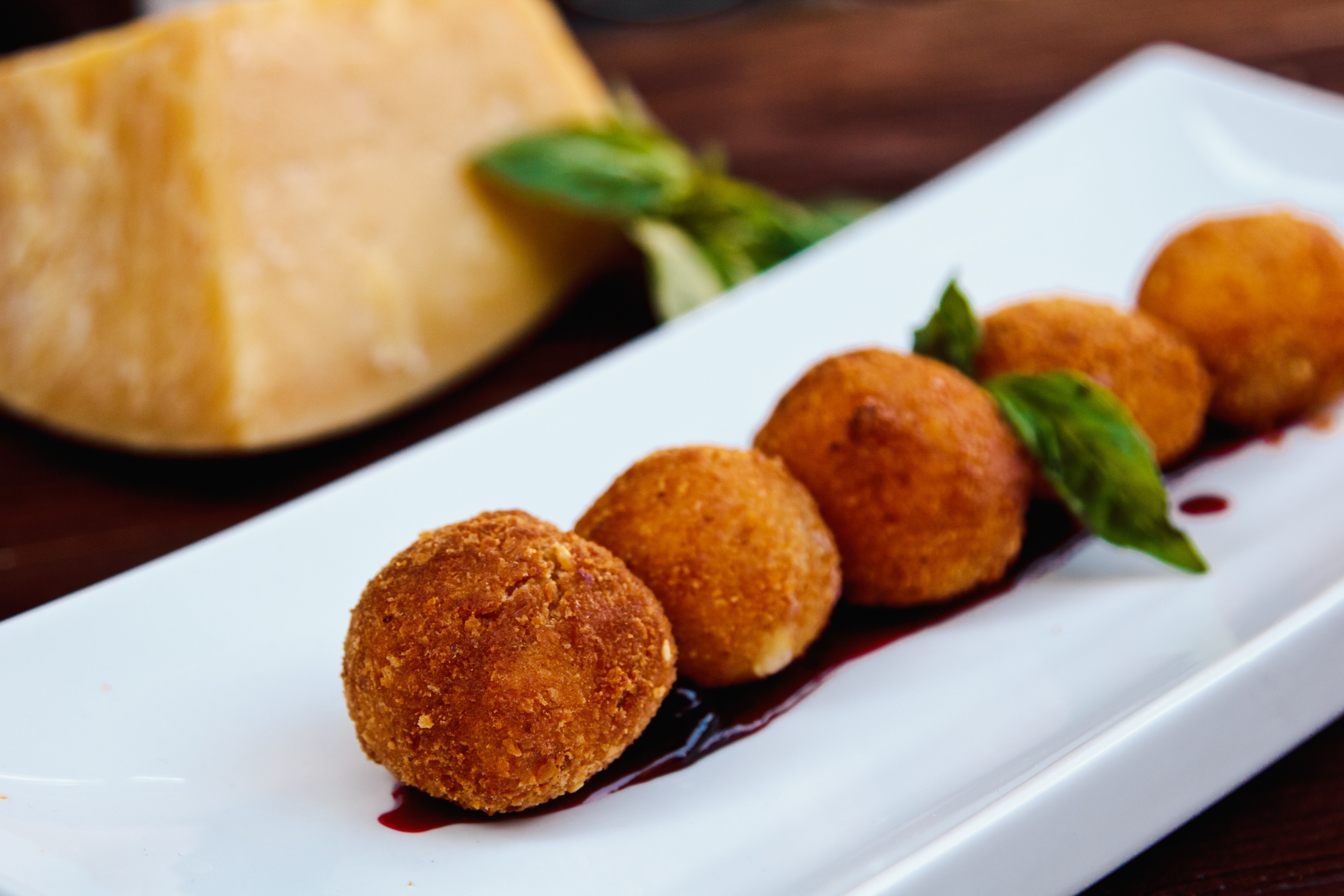 • Crispy Pork Belly Bites topped with balsamic tapenade