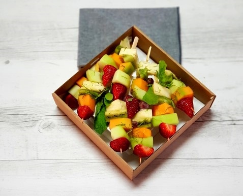 Fruit skewers, an easy handling & eating option that is always popular in a range of meetings or events. A selection of seasonal fruits, such as watermelon, cantaloupe, honeydew, strawberries, grapes and kiwi cut into cubes and presented on a  skewer.