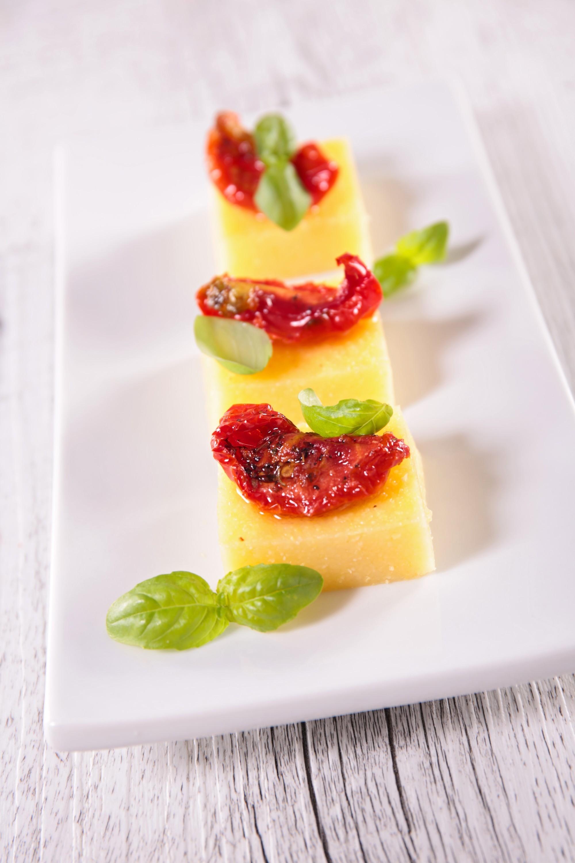 Polenta Squares sun dried tomato & parmesan served with salsa verde