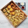 Vegetarian platter, the name says it all 100% veg! In this package you will receive, vegetable spring rolls, vegetable Gyoza, spinach & cheese roll, vegetarian quiches, arancini balls, samosas. Presented beautifully in a platter with a range of dipping sauces.